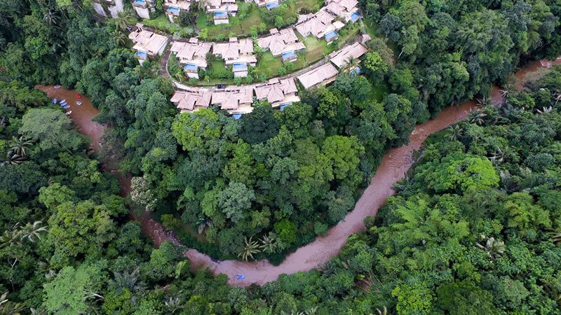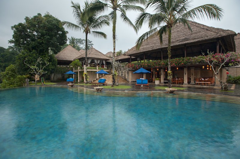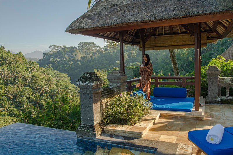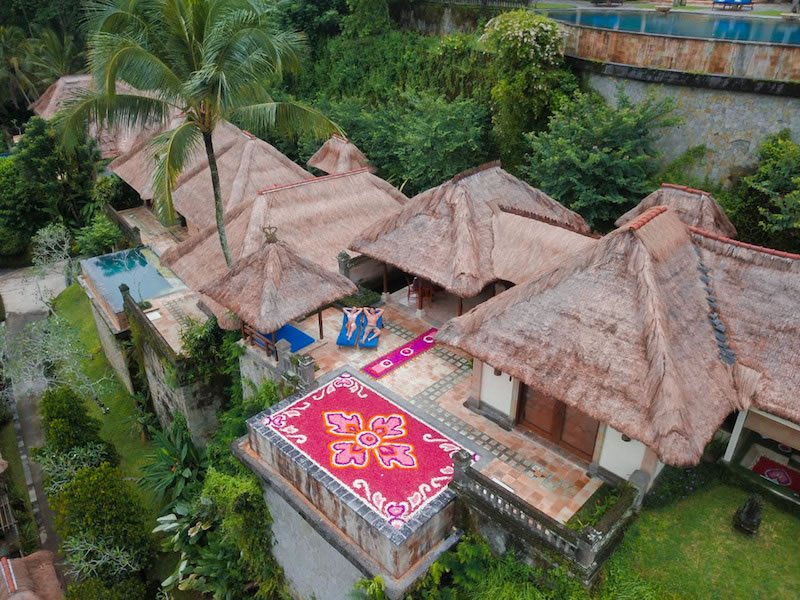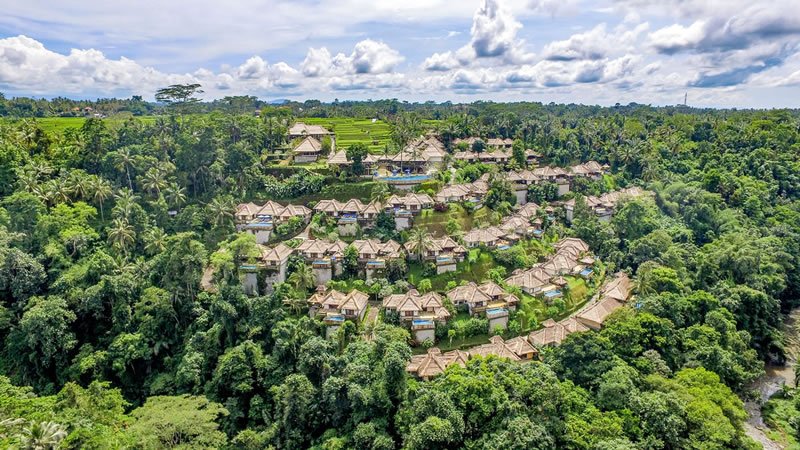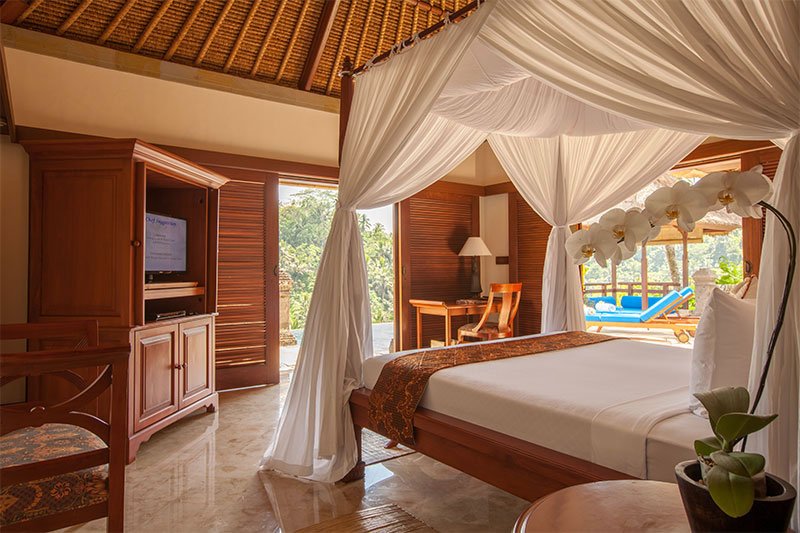 Le ville dell'hotel sono ispirate ai tradizionali complessi balinesi e presentano padiglioni all'aperto con tetti di paglia e bambù che si fondono perfettamente con lo scenario naturale. Gli interni sono caratterizzati da semplici pareti bianche, pavimenti in marmo, pietra scolpita e splendido legno duro. Le porte balinesi e i moderni mobili in teak aggiungono un sacco di carattere. Le grandi porte scorrevoli in vetro del balcone lasciano entrare molta luce naturale e aprono la camera da letto alla splendida vista sulla valle del fiume. I mobili in teak delle camere da letto sono costituiti da letti a baldacchino coperti da zanzariere, scrivania e sedia, mobile TV e un ampio armadio.