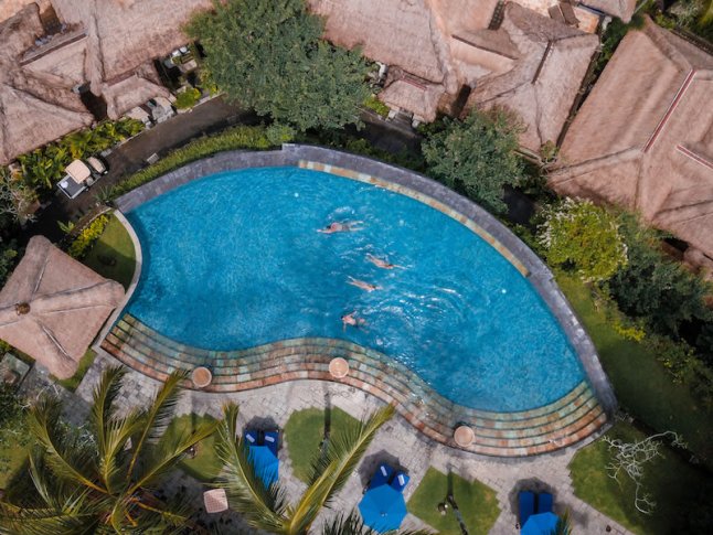 L'ambiente e l'ambientazione in tutto il Puri Wulandari Resort sono tranquilli e sembrano lontani dai trafficati centri turistici di Bali. Il lungo viale che conduce alla lobby è fiancheggiato su entrambi i lati da risaie e, entrando nella lobby, si possono intravedere le incredibili viste sulla giungla e gli ampi giardini dell'hotel ricoperti di verde. La lobby è un grande padiglione di paglia e bambù con pavimenti in marmo giallo crema e gli interni sono decorati con legno finemente intagliato e statue di pietra. L'aspetto in tutta la proprietà segue l'esempio ed è decisamente rustico-chic, che integra quelle viste sulla giungla. Una delle caratteristiche preferite è la piscina a sfioro, che è costruita lungo il bordo della scogliera per sfruttare quei panorami. Tutto, dai ristoranti alla spa, è ugualmente romantico, con stagni e acqua corrente tutt'intorno. L'hotel è più popolare tra coppie e sposi in luna di miele, ma le ville con due e tre camere da letto sono anche una buona opzione per le famiglie, anche se le piscine a sfioro e i gradini ripidi possono essere pericolosi per i bambini piccoli.