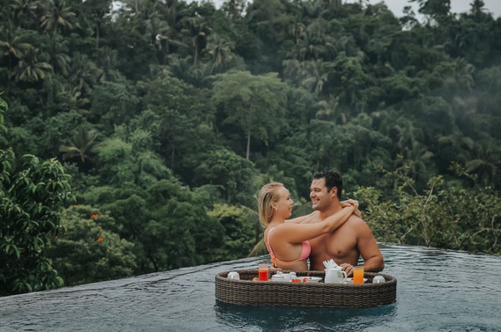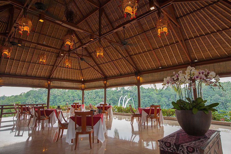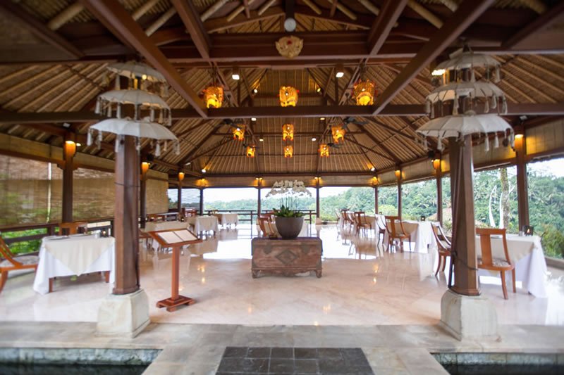 La piscina a sfioro è circondata da una terrazza in pietra fiancheggiata da sedie a sdraio con vista sulla valle del fiume. I ristoranti - Legong e Janger - sono ospitati in un edificio a due piani che si affaccia sulla piscina e sulla valle. Legong è un affare più casual per spuntini leggeri, pranzo e colazione, mentre il ristorante Janger si concentra principalmente sulla cucina asiatica raffinata.